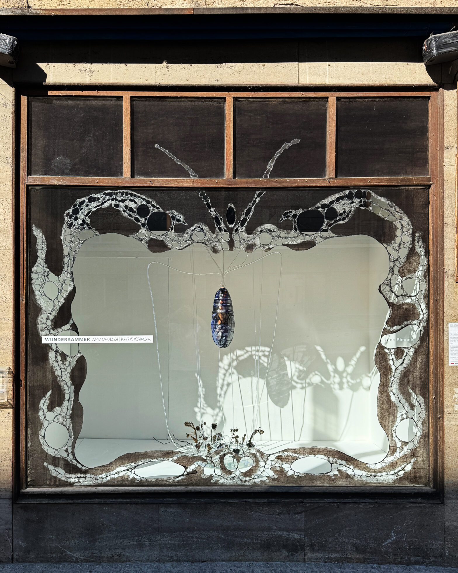 luring in moths during darkness. An intricate, ornamental pattern, ripped into the latex on the window front, frames the installation.
